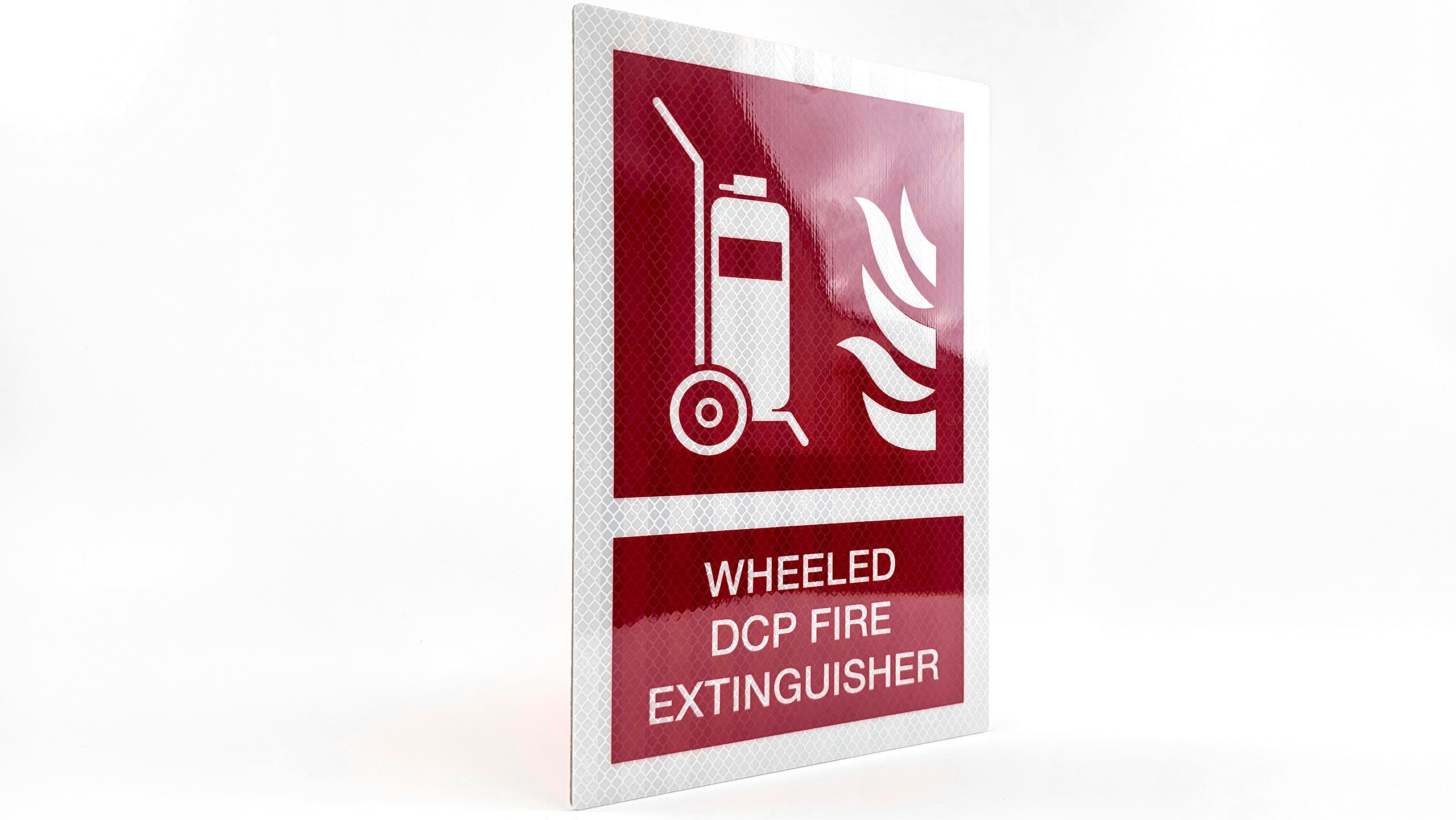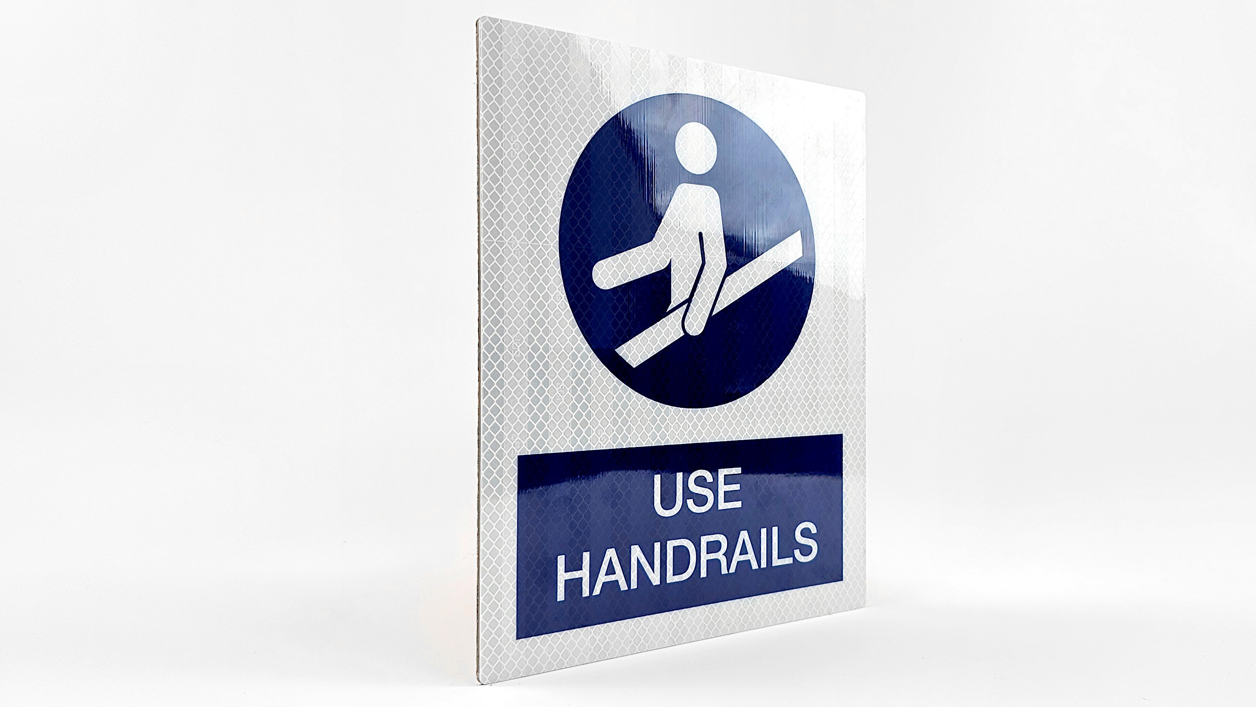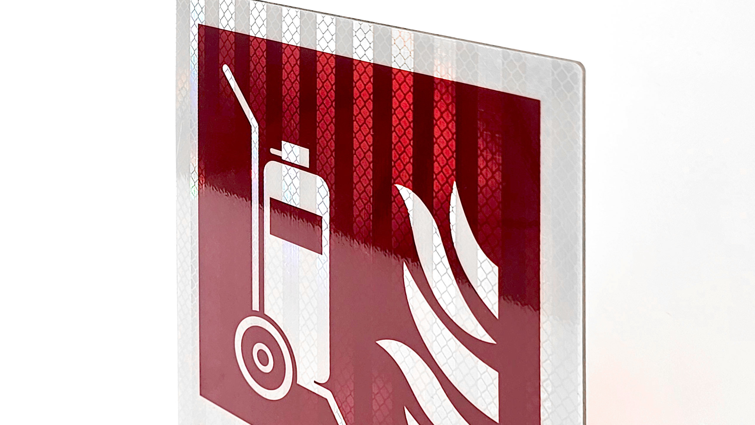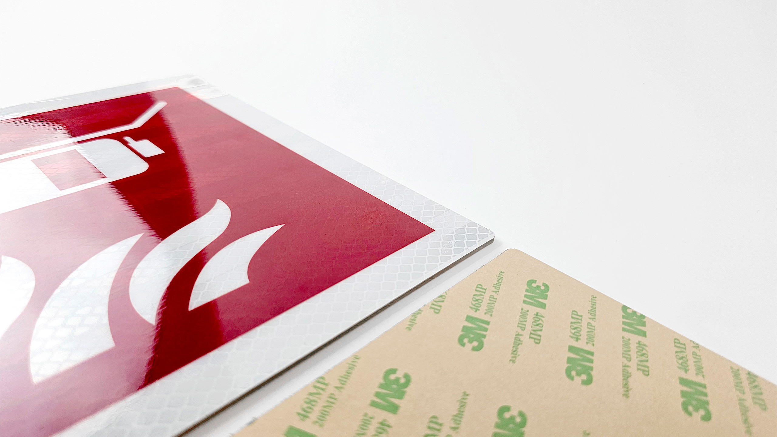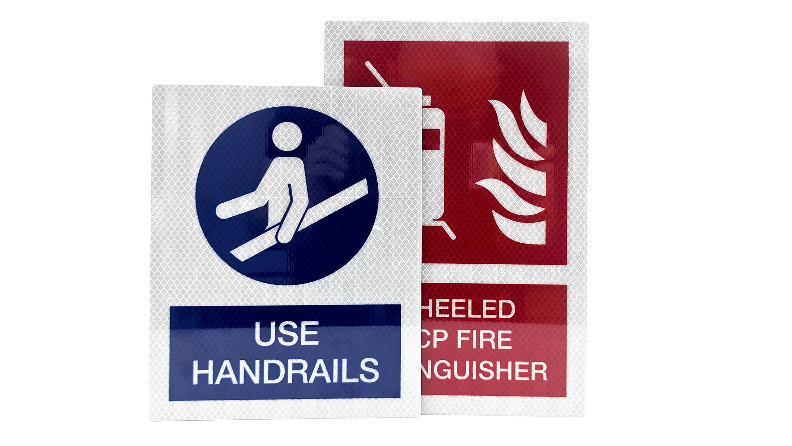 Reflective surfaces use microscopic glass beads or prismatic elements that direct light precisely back to the viewer. The Engineer Grade Prismatic film used in our IMO signage is differentiated from other prismatic or encapsulated lens materials by the distinctive surface pattern and the visible integral ‘EGP’ marking.